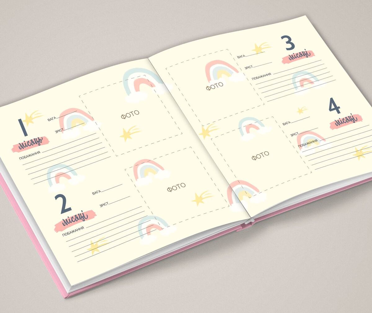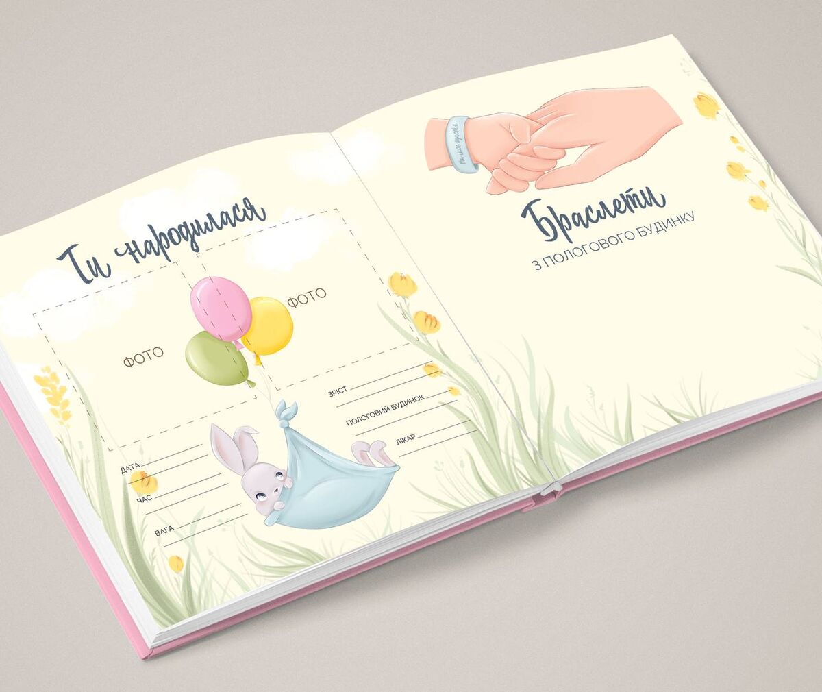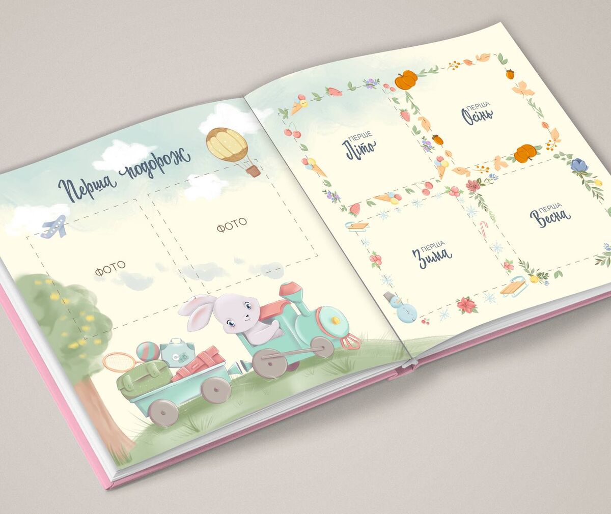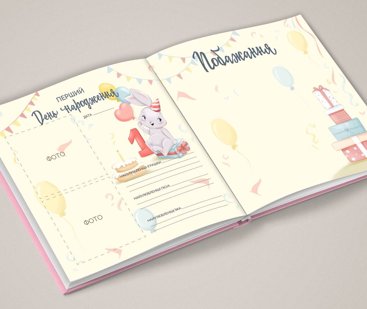 Ніжне малятко спить на хмаринці у рамці з акварельних півоній, квітів та різнокольорових пір'їнок. Ідеальний подарунок на народження дитини, хрестини або перший день народження. Ми додаємо ім'я малюка та всі важливі деталі: дату народження, час, вагу, зріст. Кожен альбом — це історія, яка зберігатиметься роками.