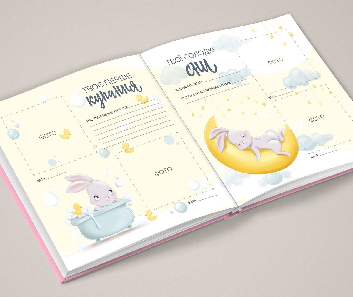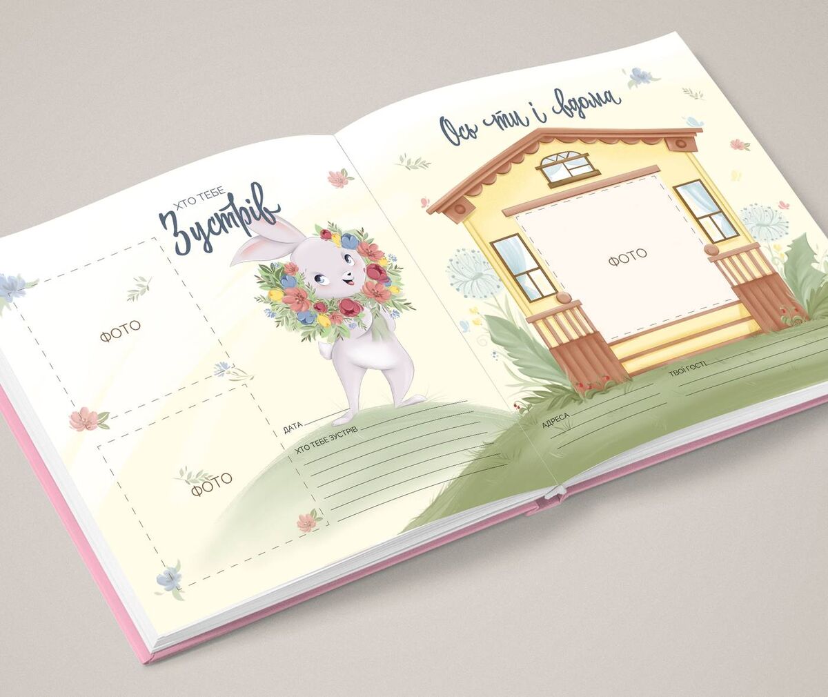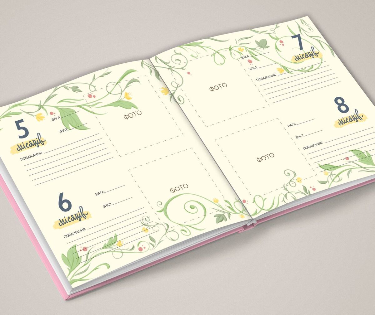 Ніжне малятко спить на хмаринці у рамці з акварельних півоній, квітів та різнокольорових пір'їнок. Ідеальний подарунок на народження дитини, хрестини або перший день народження. Ми додаємо ім'я малюка та всі важливі деталі: дату народження, час, вагу, зріст. Кожен альбом — це історія, яка зберігатиметься роками.